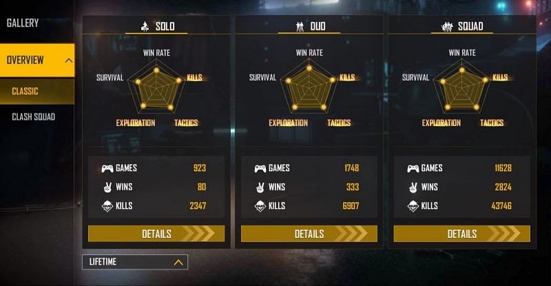 The famous YouTuber has 333 Booyahs in 1748 duo games, resulting in a win rate of 19.05%. In these matches, he has eliminated 6907 foes at a K/D ratio of 4.88. Out of the total kills, 2367 have been registered as headshots for a percentage of 34.27%.